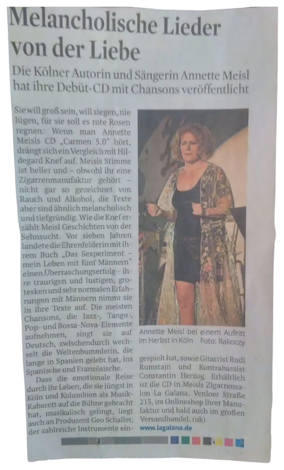 When listening to Annette Meisl's CD "Carmen 5.0," a comparison with Hildegard Knef comes to mind. Meisl's voice is brighter and - although she owns a cigar manufactory - not quite so marked by smoke and alcohol, but the lyrics are similarly melancholic and profound. Like Knef, Meisl tells stories of longing. Seven years ago, the Ehrenfeld resident landed a surprise success with her book "Das Sexperiment - mein Leben mit fünf Männern" - she incorporates her sad and funny, grotesque and very normal experiences with men into her lyrics. Most of the chansons, which incorporate jazz, tango, pop and bossa nova elements, she sings in German, intermittently the globetrotter, who lived in Spain for a long time, switches to Spanish and French. That the emotional journey through her life, which she recently brought to the stage in Cologne and Colombia as music cabaret, succeeds musically is also due to producer Geo Schaller, who played numerous instruments, as well as guitarist Rudi Rumstajn and double bassist Constantin Herzog. The CD is available in Meisl's cigar salon La Galana, Venloer Strasse 213, in the online shop of her manufactory and soon also in major mail order retail. (uk)
